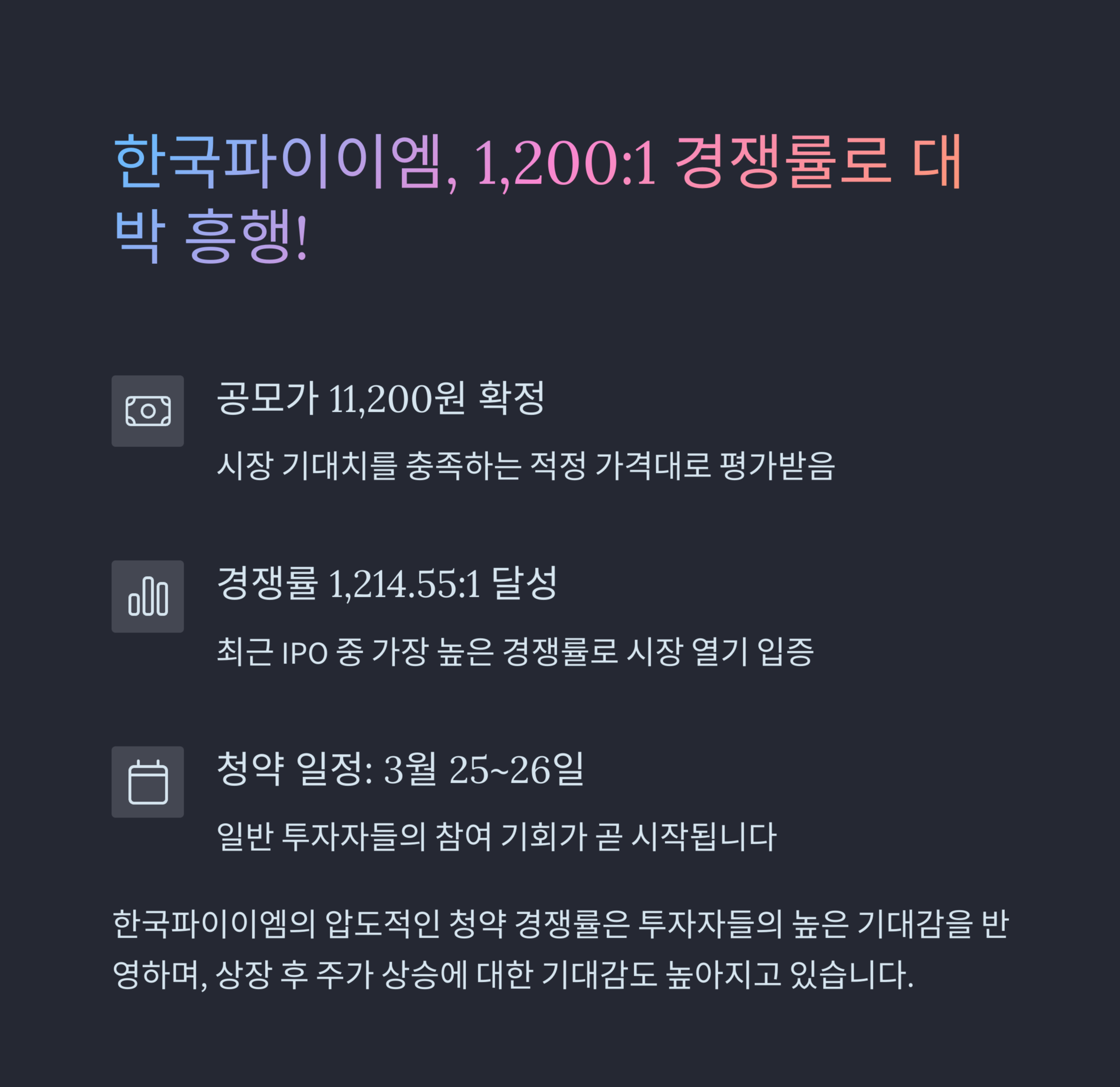 | 한국파이이엠 청약 일정 | 2025년 3월 25일~26일 |