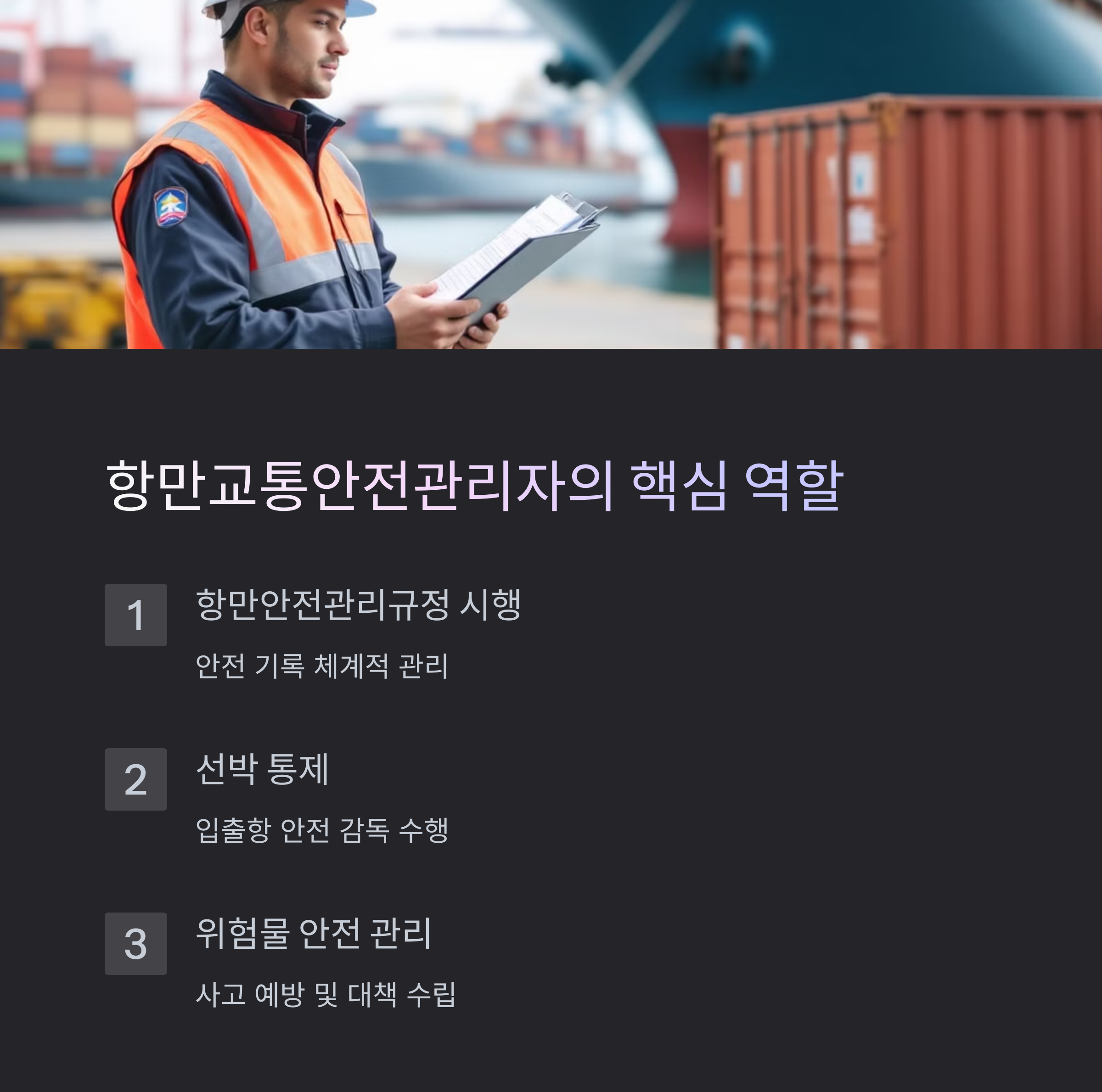 여러분! 항만은 물류와 교통이 활발하게 이루어지는 중요한 공간이죠. 하지만 바닷길과 육상 교통이 만나는 곳인 만큼, 사고 예방과 안전 관리가 필수적입니다. 이때 핵심적인 역할을 하는 사람이 바로 항만교통안전관리자입니다. 오늘은 이 직업이 정확히 어떤 역할을 하는지, 그리고 자격을 취득하려면 어떤 절차가 필요한지 자세히 알아보겠습니다.