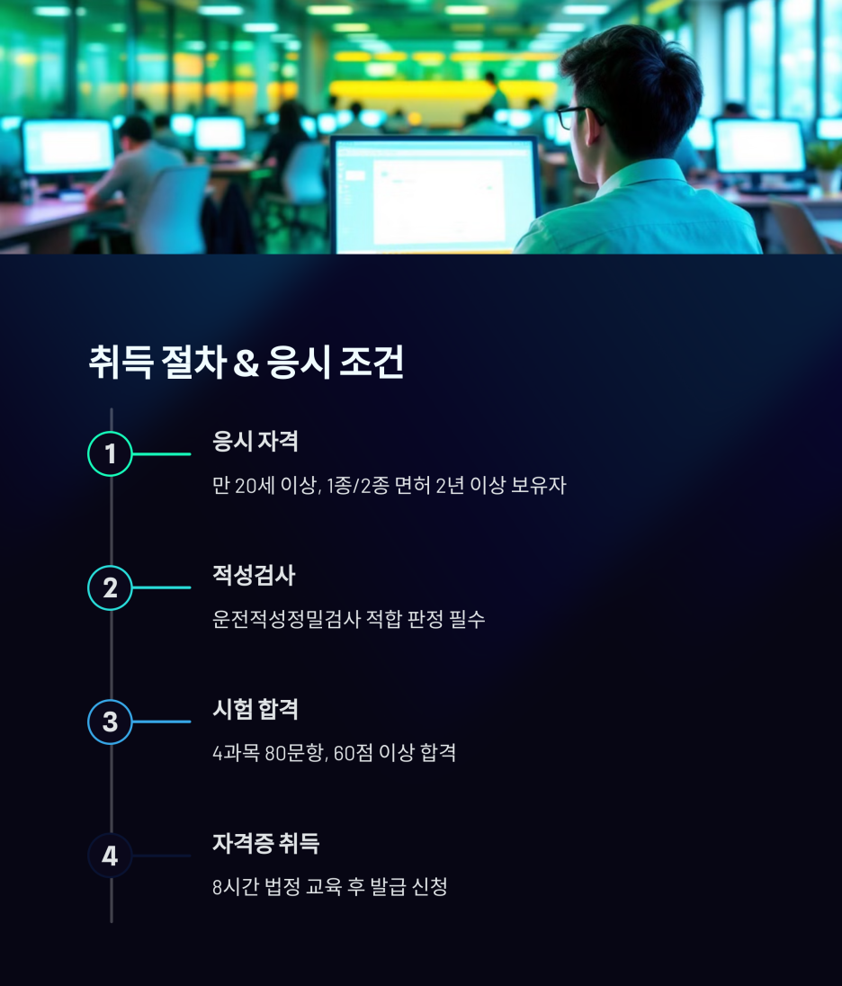 - 신규 취득자: 교통안전공단에서 지정한 교육기관에서 8시간의 기본교육 이수