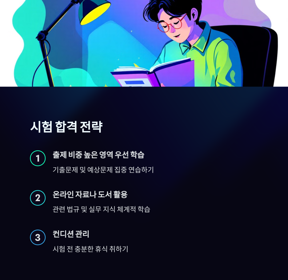 - 기출문제 분석: 최근 기출문제를 충분히 풀어보세요. 출제 경향과 중요 주제를 파악할 수 있습니다.