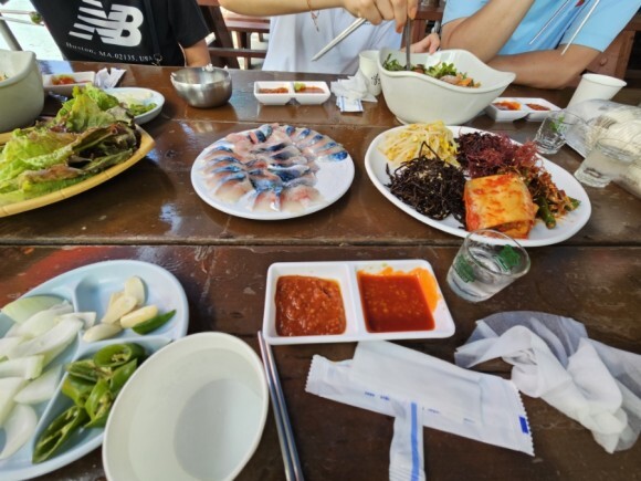 터미널에서 3시 30분 배편인데, 2시경 도착하여 고등어회 한 접시 5만 원과, 물회 3개 시키고, 소주 한 병하고 나누어 먹고 배 타고 복귀했네요
