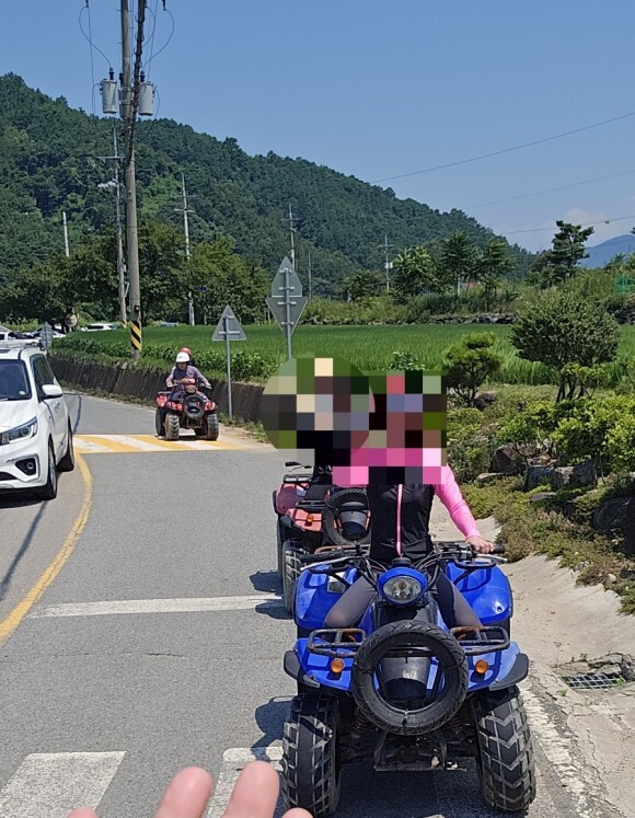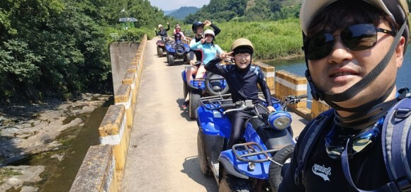 오늘은 울 가족, 큰애는 학원 때문에 안되고 작은 애랑 지인네 가족과 함께 산청 래프팅과, ATV 당일치기 다녀왔습니다