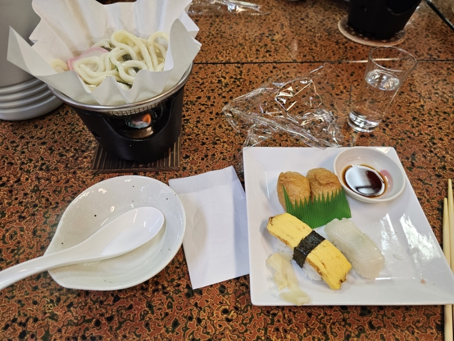 깔끔한 튀김과, 우동, 김밥과, 유부초밥으로 먹었네요