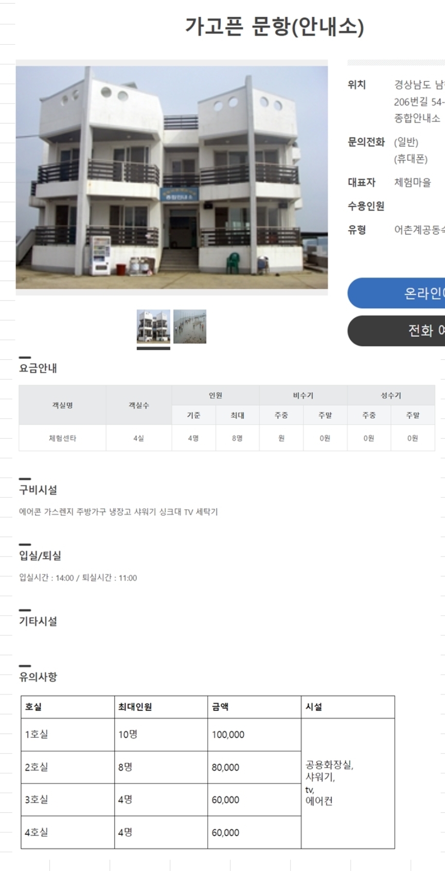 1박 2일 경남어촌체크인 참가로 지원도 좀 받기로 하고, 마을에서 운영하는 가고픈 문항, 1호실로 잡았습니다