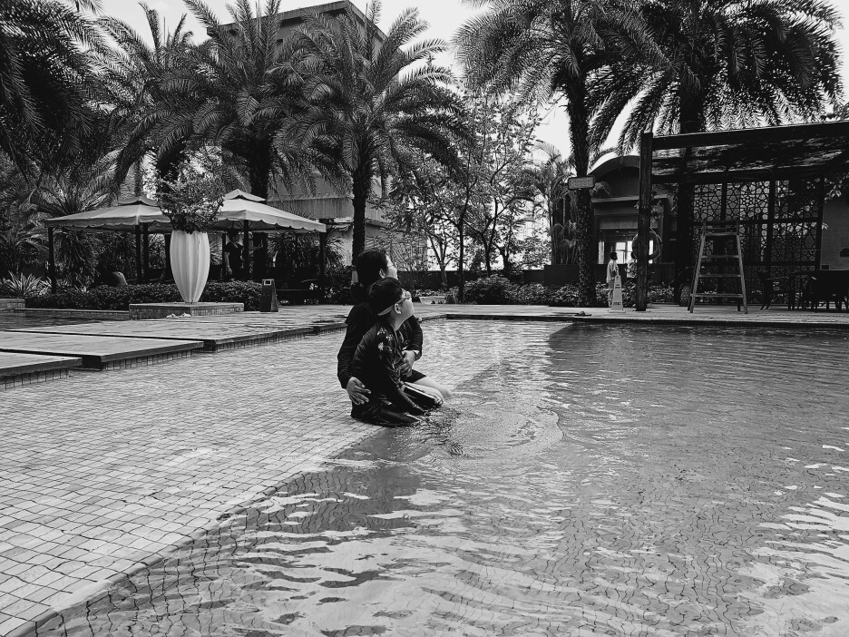 조식 후 자유시간 중, 호텔 2층 풀장에서 수영