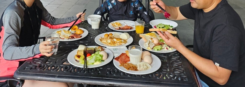 수영복 입고, 많이 질리지만, 조식을 먹고