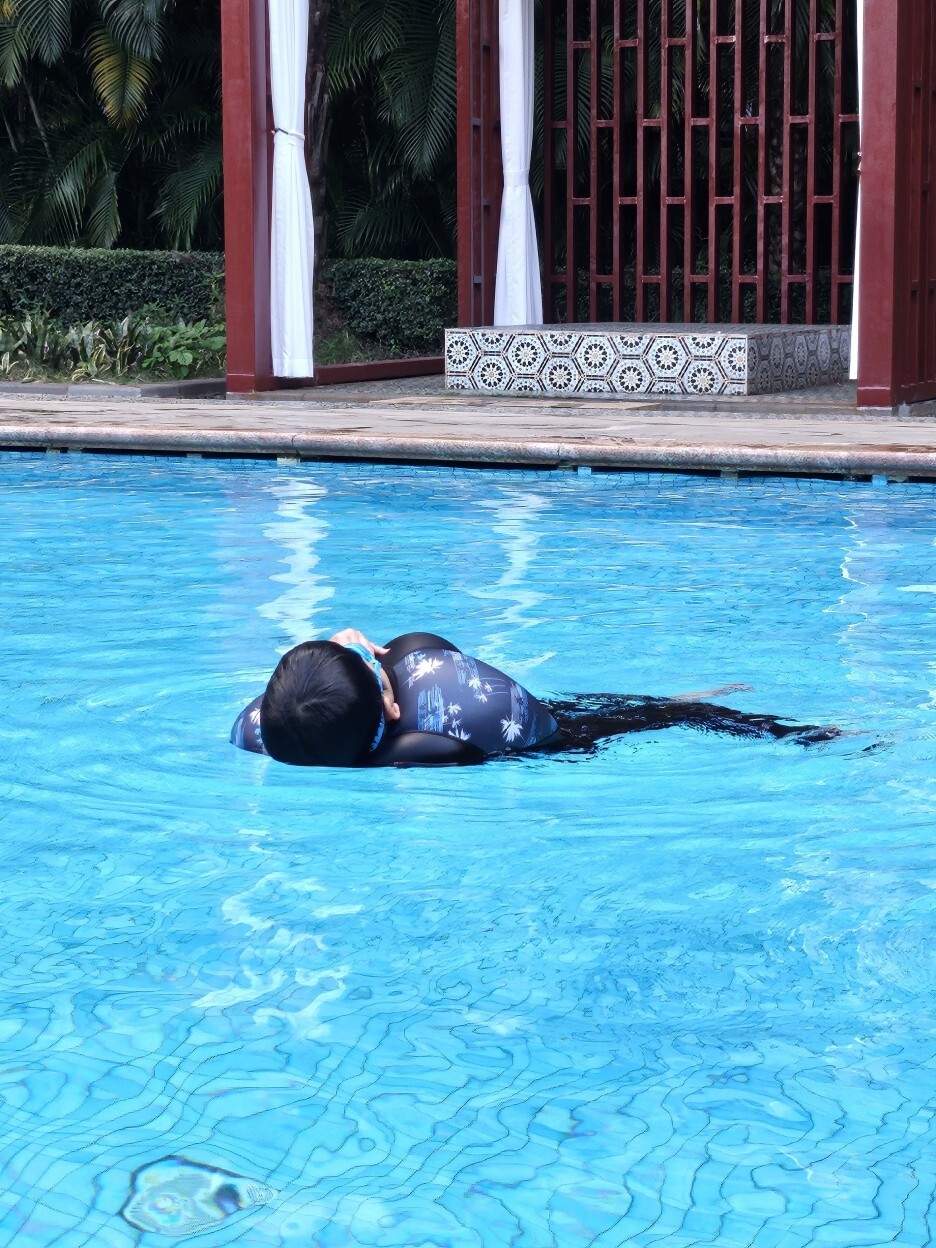 조식 후 자유시간 중, 호텔 2층 풀장에서 수영