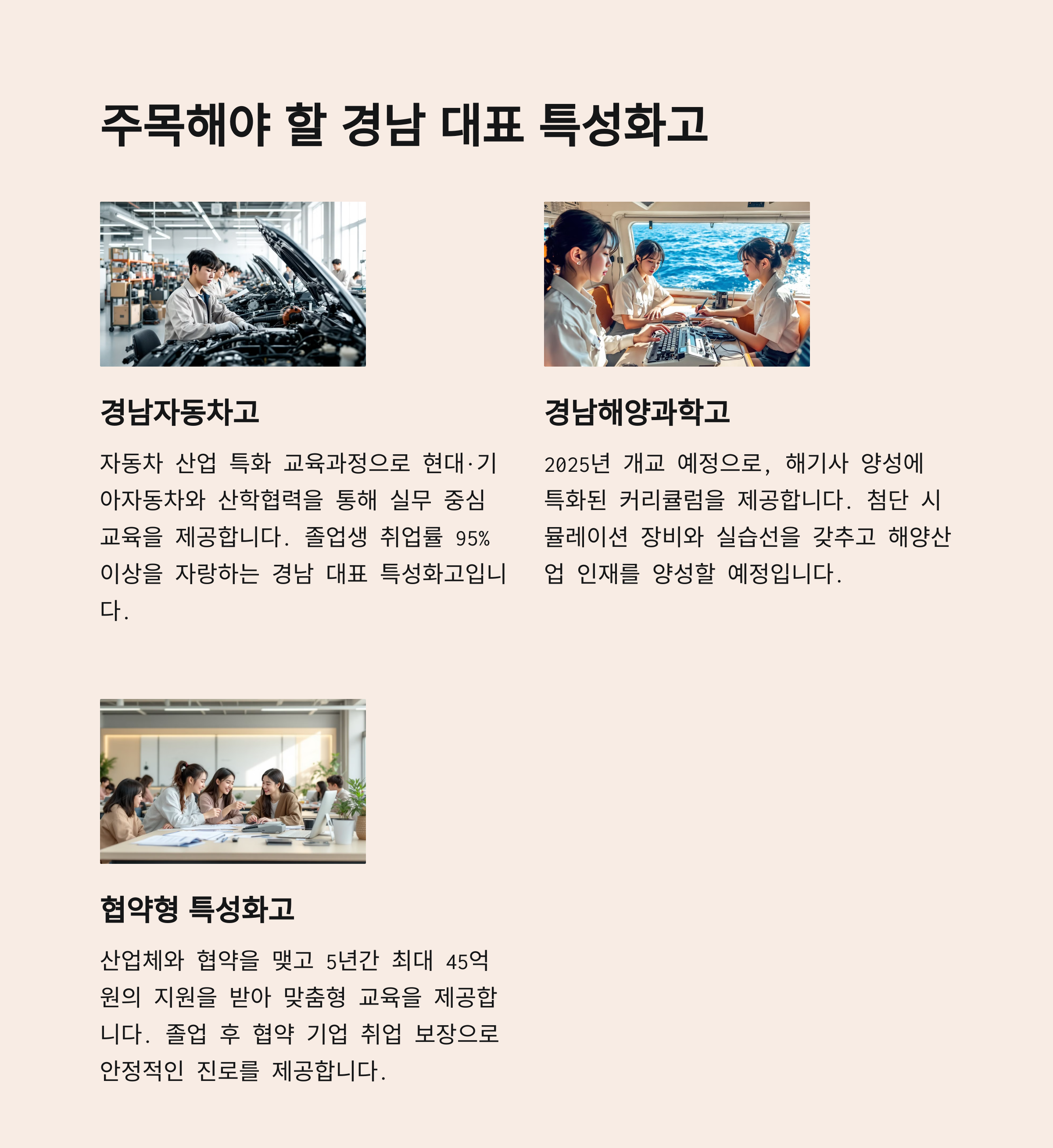 경남 특성화고는 크게 특정분야 인재 양성 특성화고(31개교), 체험 위주 특성화고(4개교), 일반고 내 특성화과(2개교)로 구분됩니다. 이러한 학교들은 학생들이 실무 중심의 교육을 통해 졸업 후 취업이나 대학 진학을 선택할 수 있도록 체계적인 지원을 하고 있습니다.