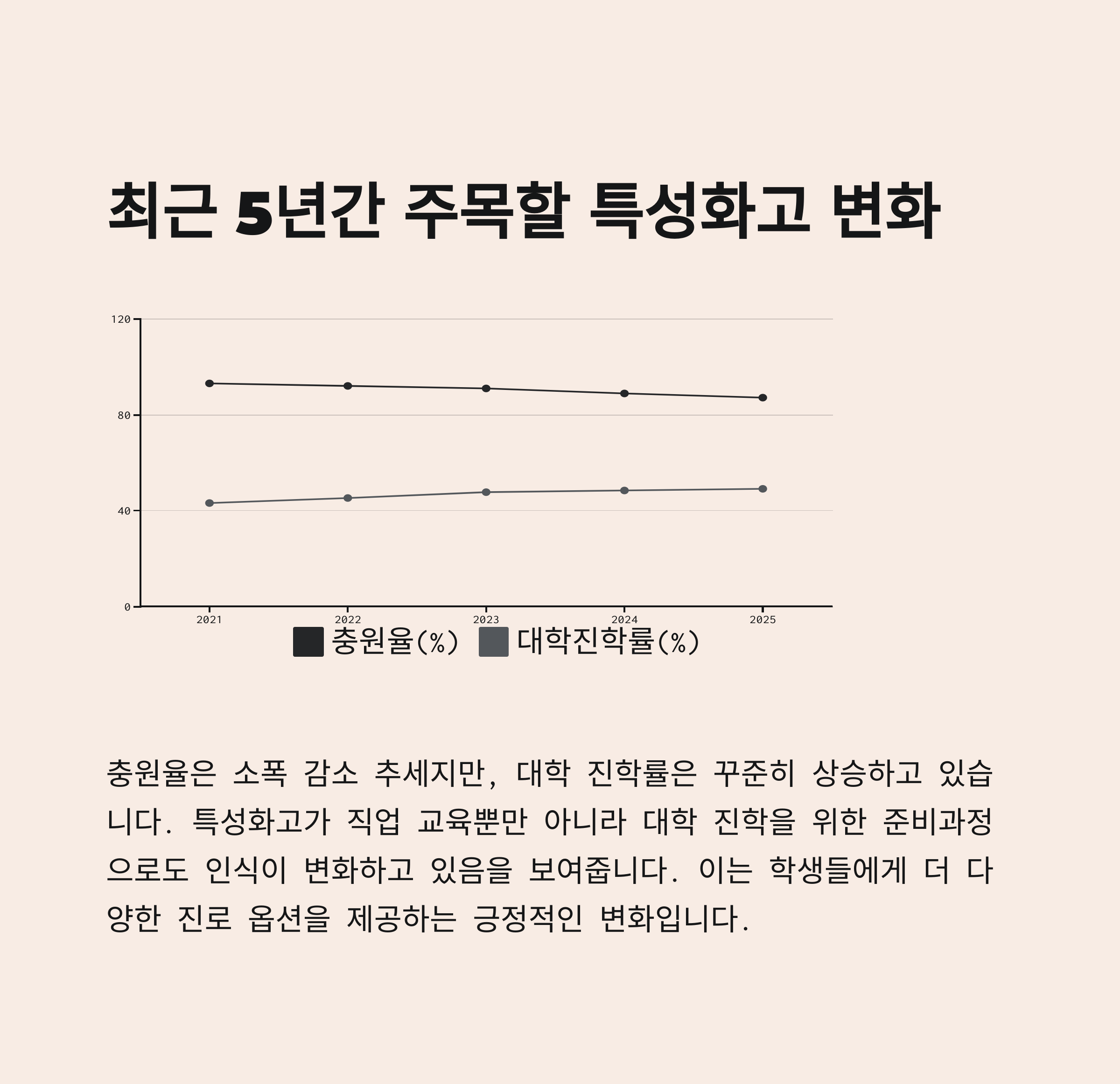 충원율의 경우 2023년 91%에서 2024년 86.1%로 감소했으나, 2025년 다시 87%로 회복세를 보이고 있습니다. 또한, 대학 진학률은 2021년 43.1%에서 2023년 47.7%로 꾸준히 증가하며, 특성화고 학생들의 진로 선택 폭이 넓어지고 있습니다.