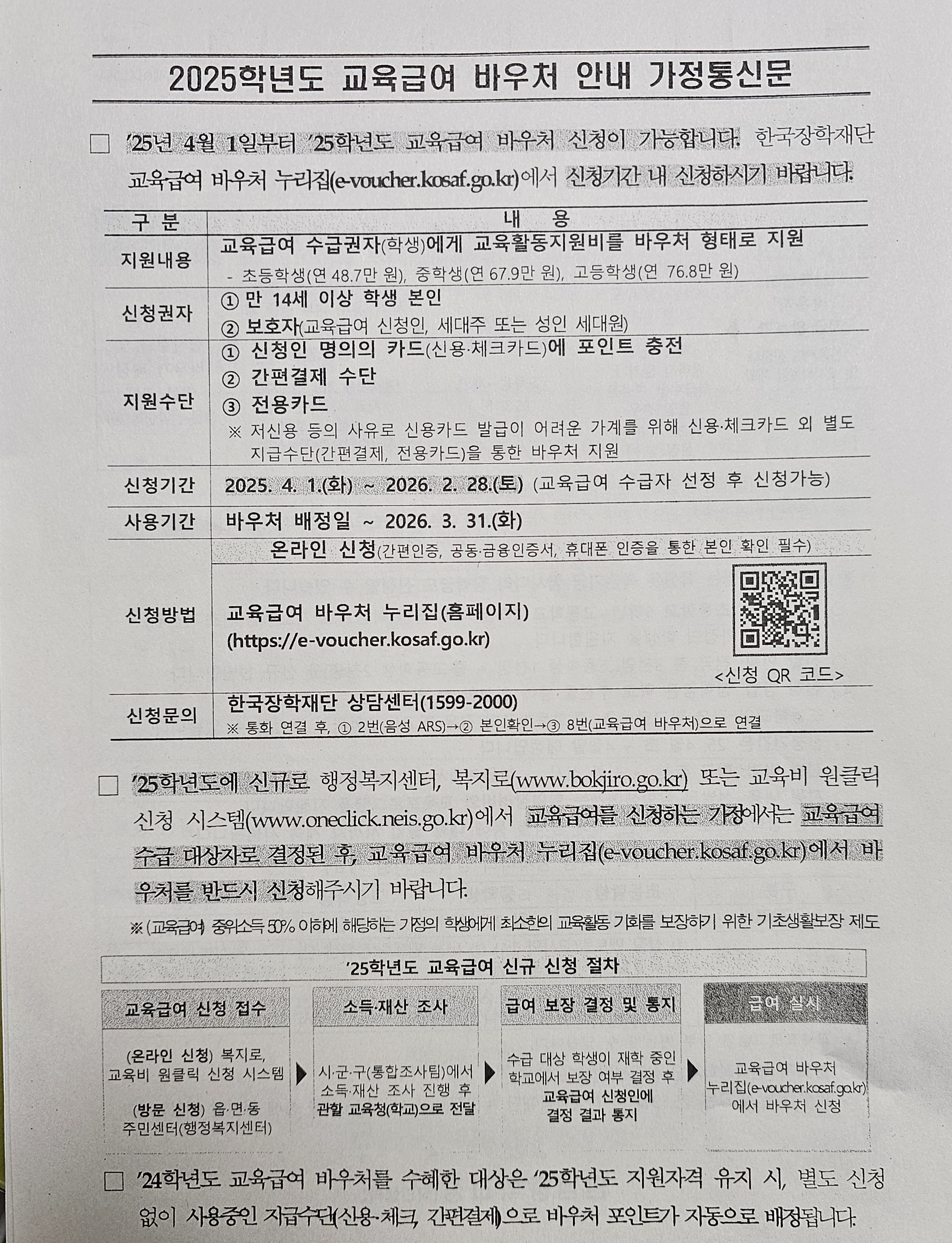 오늘 중학교 입학식 다녀와서 2025학년도 교육급여 바우처 안내 가정통신문을 받아왔네요.