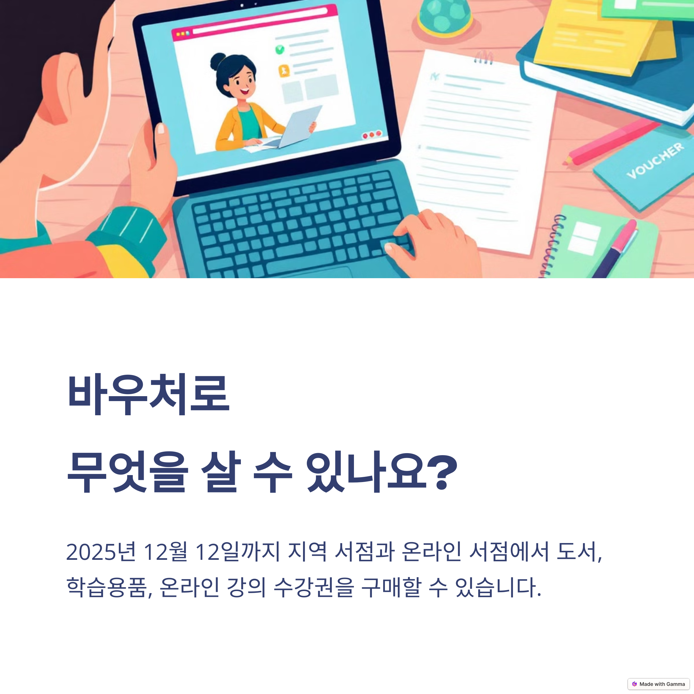 교육지원 바우처는 저소득 가정의 학생들에게 교육 관련 비용을 지원하는 제도입니다. 1인당 10만 원의 포인트가 적립된 카드를 지급받아 도서와 학습용품 구매 등에 활용할 수 있습니다.