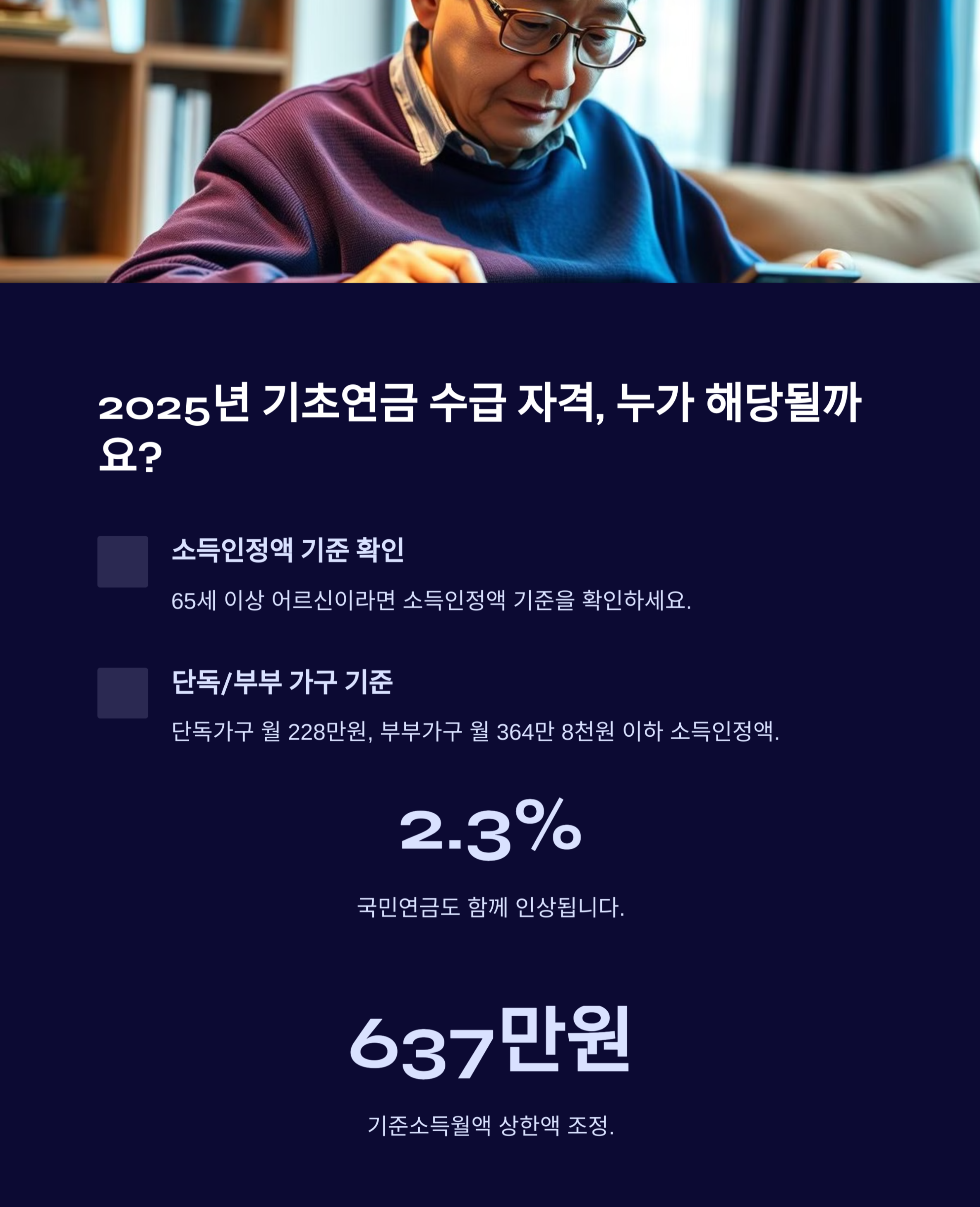 기초연금 수급 자격에는 소득인정액 기준, 연령 기준 등 다양한 요소가 포함됩니다. 특히 2025년에는 다음과 같은 주요 변경사항이 반영됩니다: