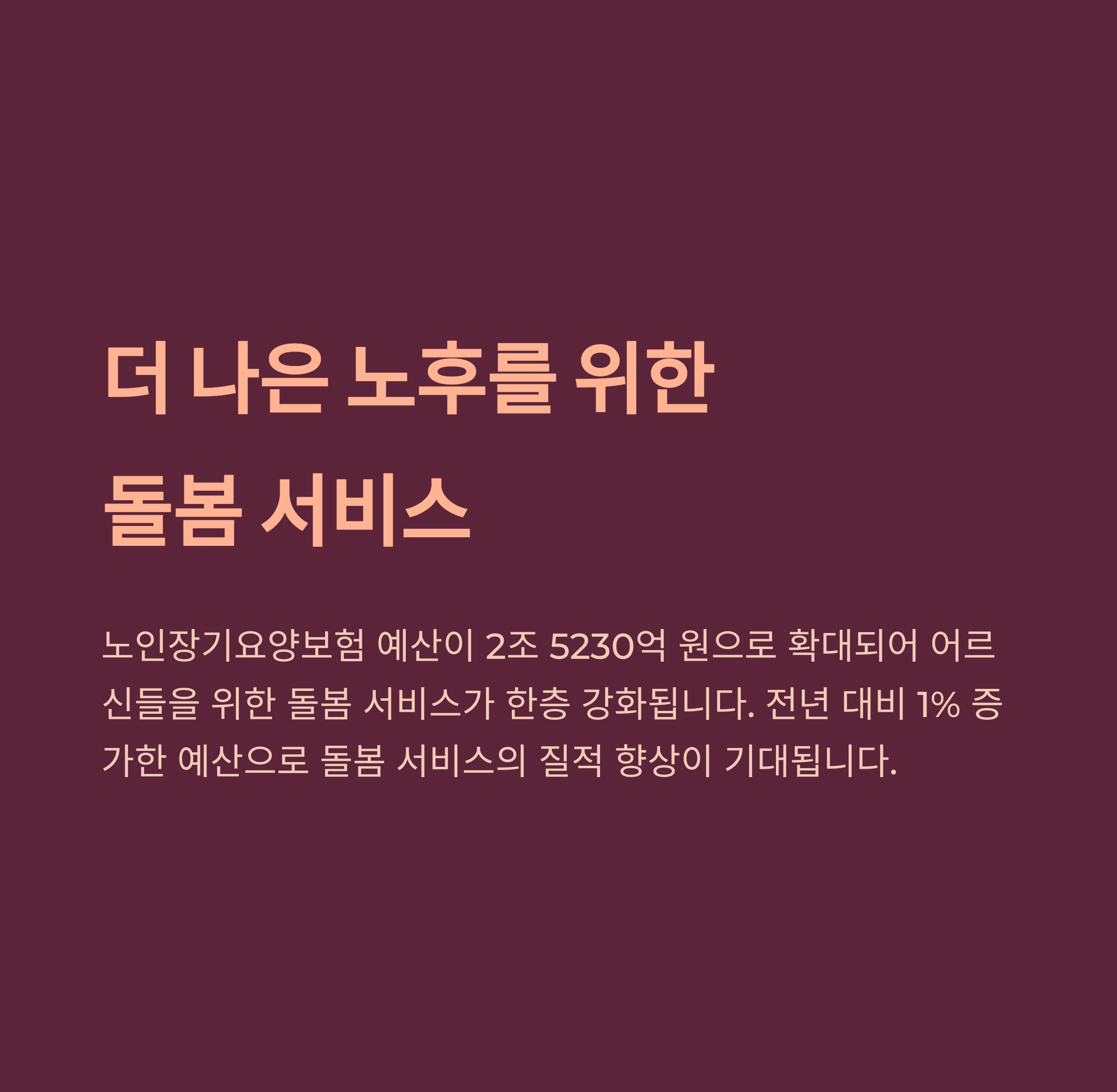 | 노인장기요양보험 | 운영 지원 예산은 2조 5230억 원이며, 보험료율은 동결될 예정입니다. |