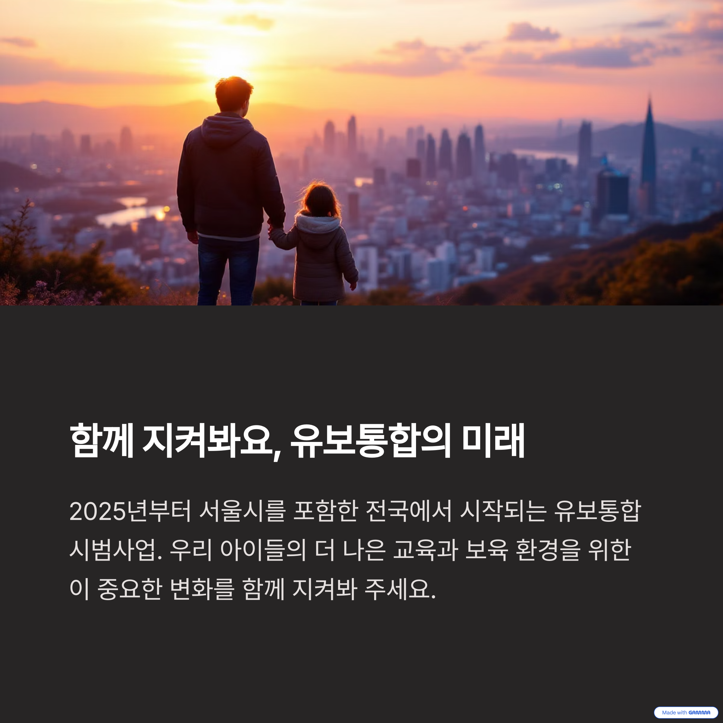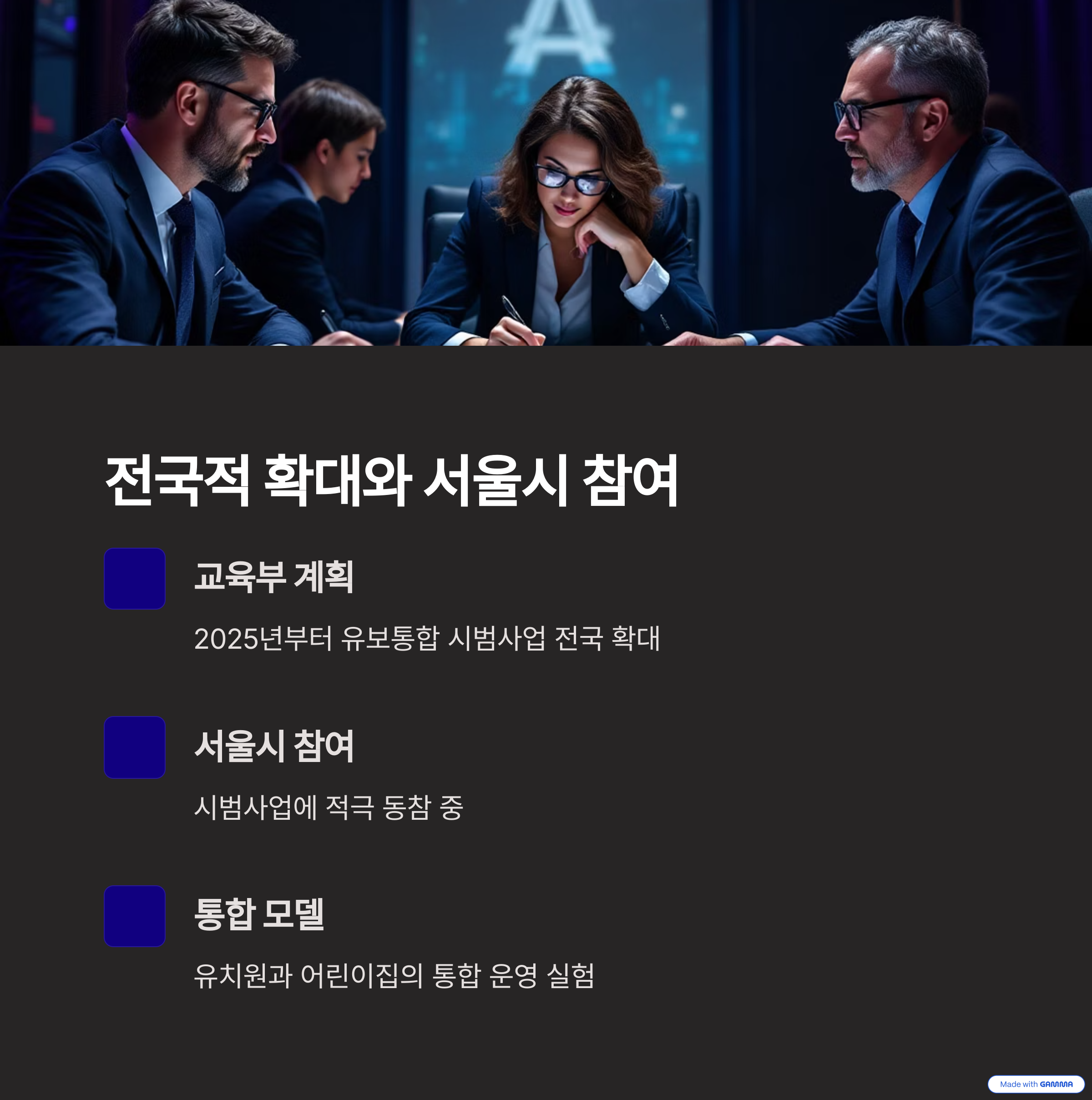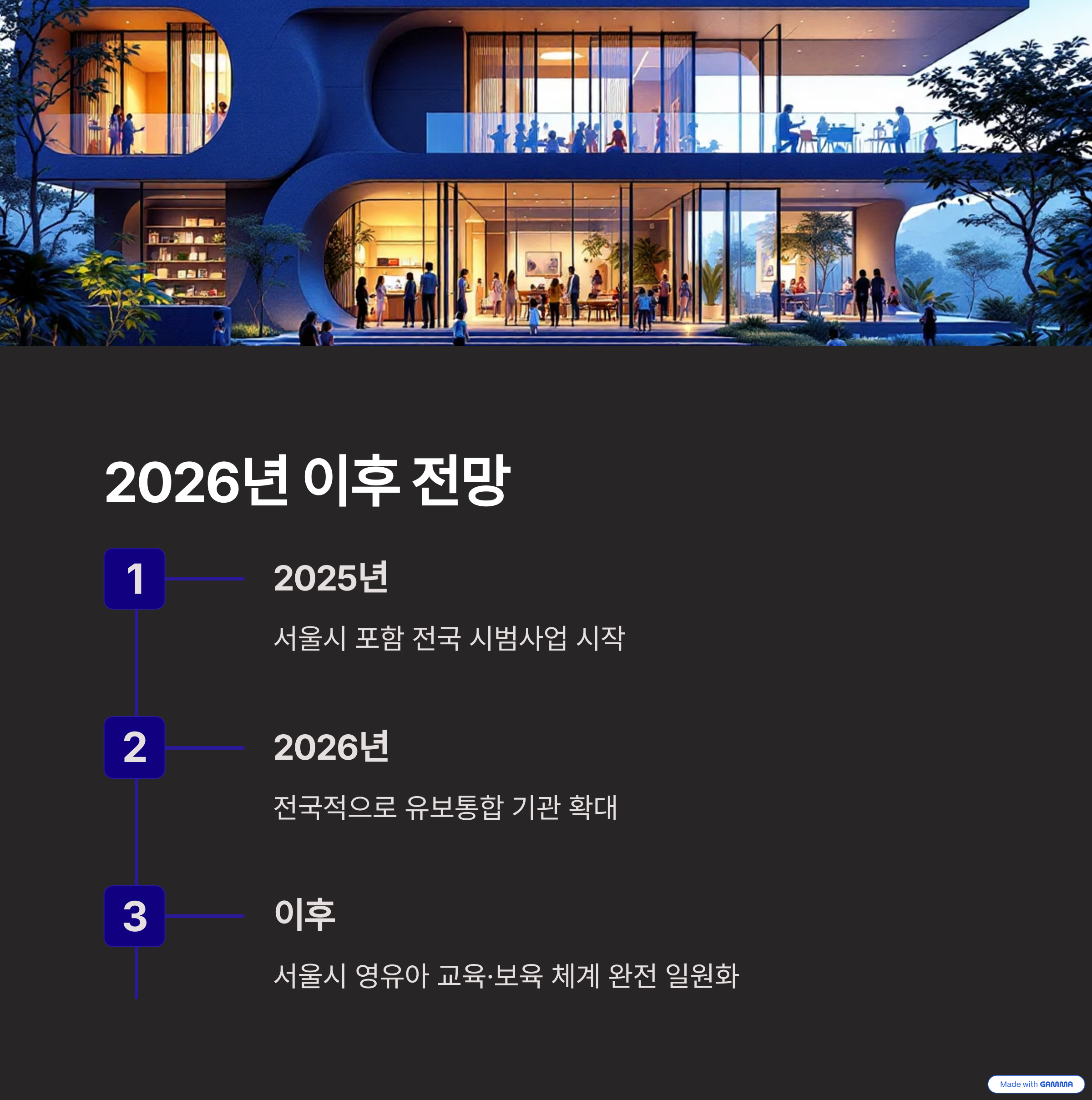 2025년부터 시작되는 유보통합 시범사업은 서울시를 포함한 전국적으로 확대될 예정입니다. 서울시교육청은 이를 위해 다양한 지원 체계를 마련하고 있으며, 이를 통해 서울시 내 영유아 교육·보육 체계의 일원화가 기대됩니다 .