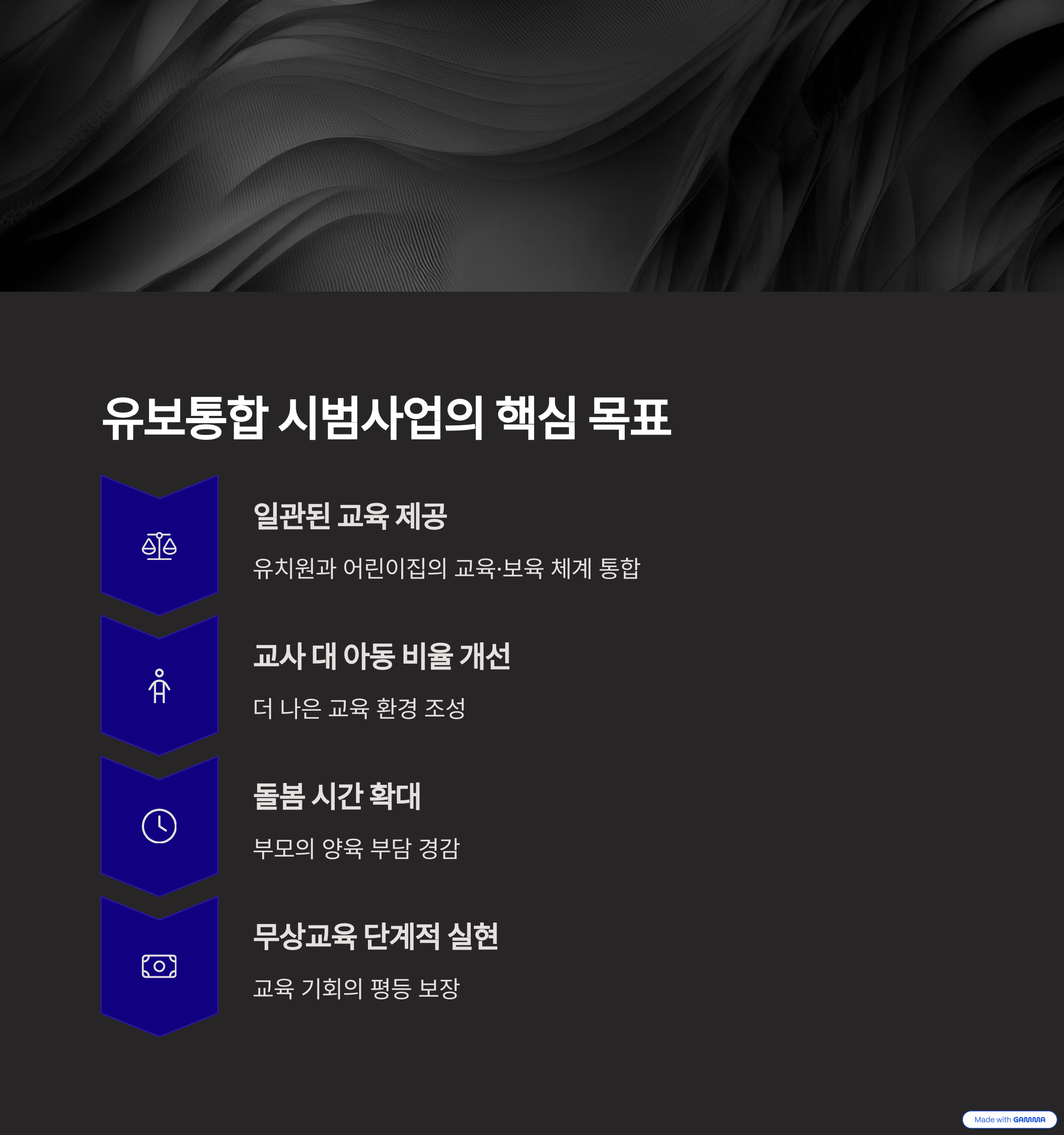 유보통합 시범사업은 유치원과 어린이집의 교육·보육 체계를 통합하여 영유아에게 일관된 교육을 제공하는 것을 목표로 합니다. 이를 위해 교사 대 아동 비율 개선, 돌봄 시간 확대, 무상교육 단계적 실현 등의 정책이 추진되고 있습니다 .(Goover, Gift 9598)