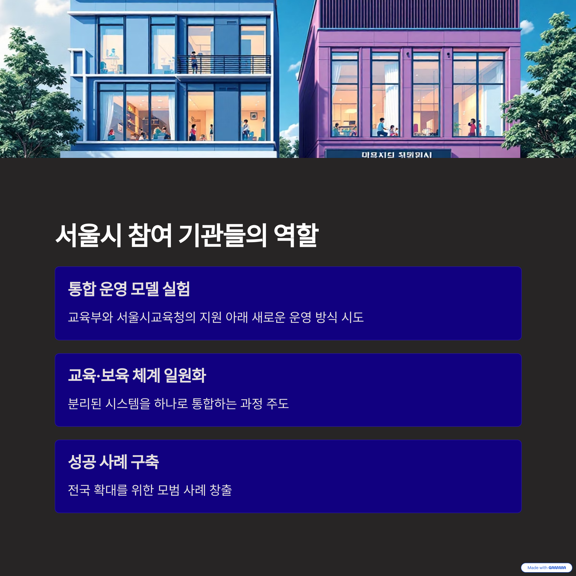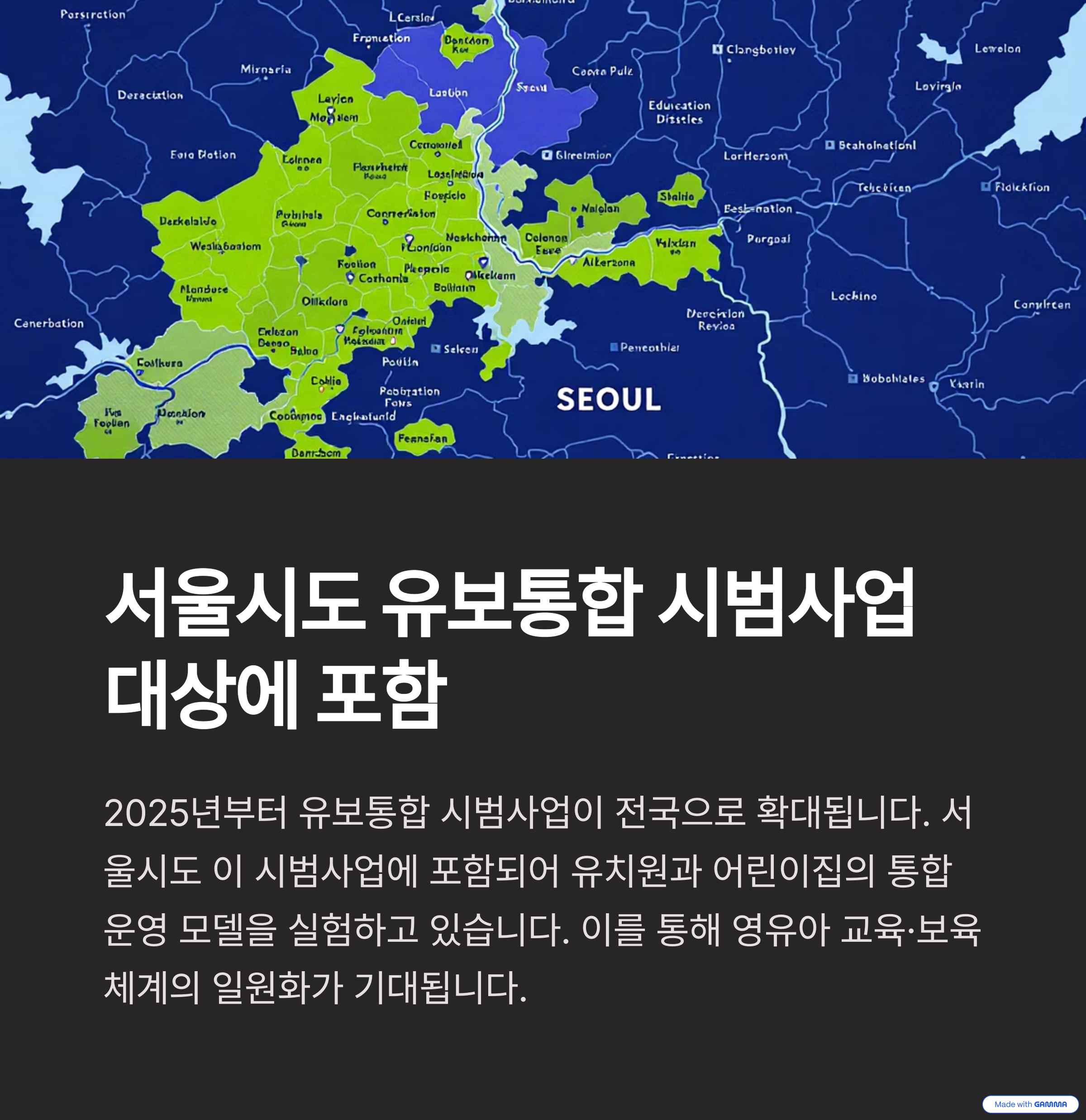2025년부터 본격 추진되는 유보통합 시범사업은 전국적으로 확대될 예정입니다. 서울시 역시 이 시범사업의 대상 지역에 포함되어, 유치원과 어린이집의 통합 운영 모델을 실험하고 있습니다. 이를 통해 서울시 내 영유아 교육·보육 체계의 일원화가 기대됩니다.