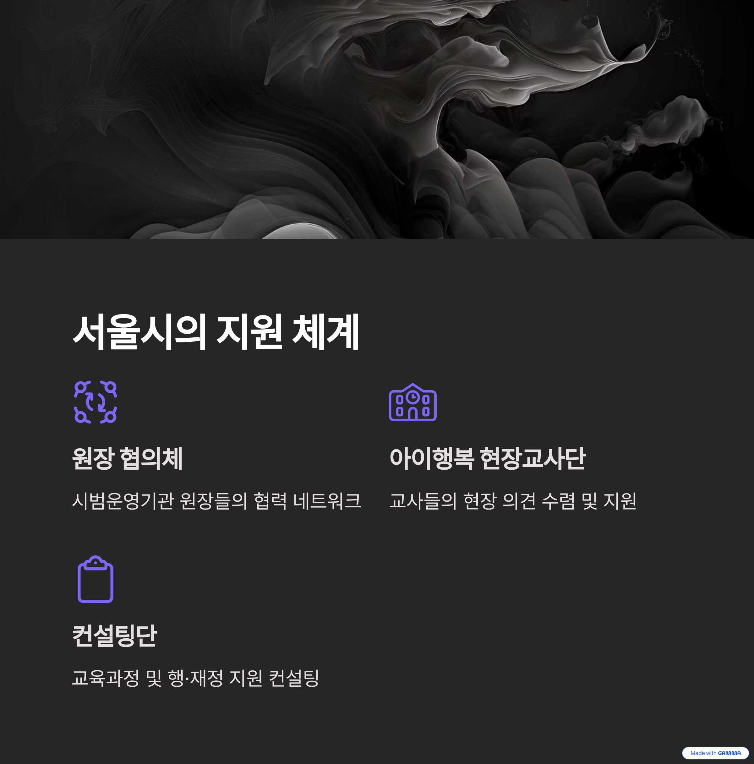 서울시교육청은 유보통합 시범사업의 성공적인 추진을 위해 다양한 지원 체계를 마련하고 있습니다. 시범운영기관 원장 협의체, 아이행복 현장교사단, 교육과정 및 행·재정 지원 컨설팅단 등을 운영하여 시범사업의 내실을 기하고 있습니다 .(세계환경신문)