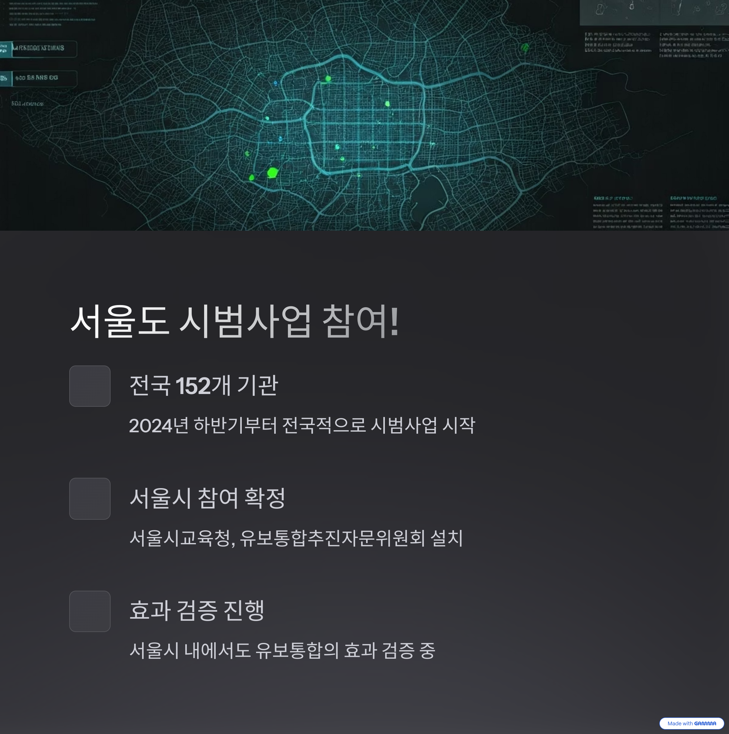 2024년 하반기부터 전국 152개 기관에서 유보통합 시범사업이 시작되었으며, 서울시도 이 시범사업에 포함되어 있습니다. 서울시교육청은 유보통합추진자문위원회를 설치하여 시범사업을 지원하고 있으며, 이를 통해 서울시 내에서도 유보통합의 효과를 검증하고 있습니다.