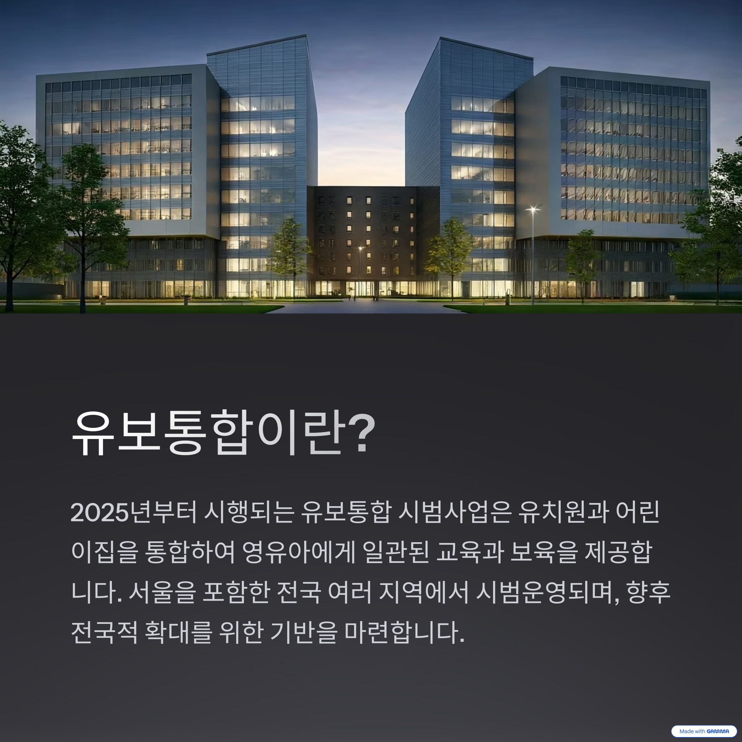 유보통합은 유치원과 어린이집의 이원화된 체계를 통합하여, 영유아에게 보다 일관된 교육과 보육 서비스를 제공하는 정책입니다. 이를 통해 교육과 보육의 질을 향상시키고, 부모의 양육 부담을 경감시키는 것을 목표로 합니다.