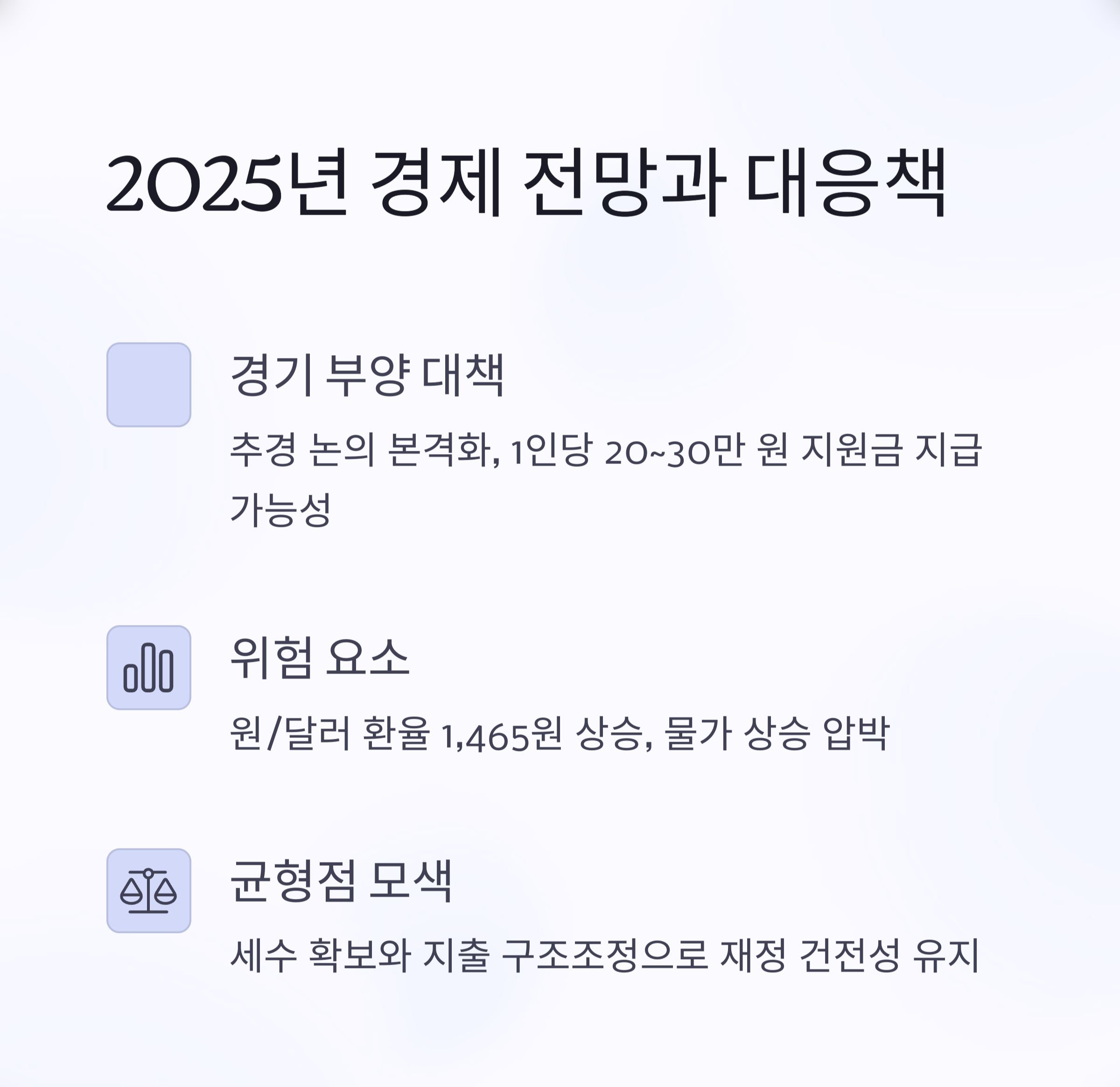 1. 재정 문제와 세수 결손: 정부는 재정 건전성을 강조하며 추가경정예산(추경)을 억제해 왔으나, 2023년과 2024년 연속 세수 결손(각각 56.4조 원, 29.6조 원)이 발생했습니다. 2025년에는 국고채 발행 규모가 2024년 158조 4천억 원에서 197조 6천억 원으로 증가할 예정이며, 경기 부양을 위한 추경 논의가 본격화될 수 있습니다. 이는 민생 회복 지원금(예: 1인당 20~30만 원) 지급과 같은 정책으로 이어질 가능성이 있습니다.