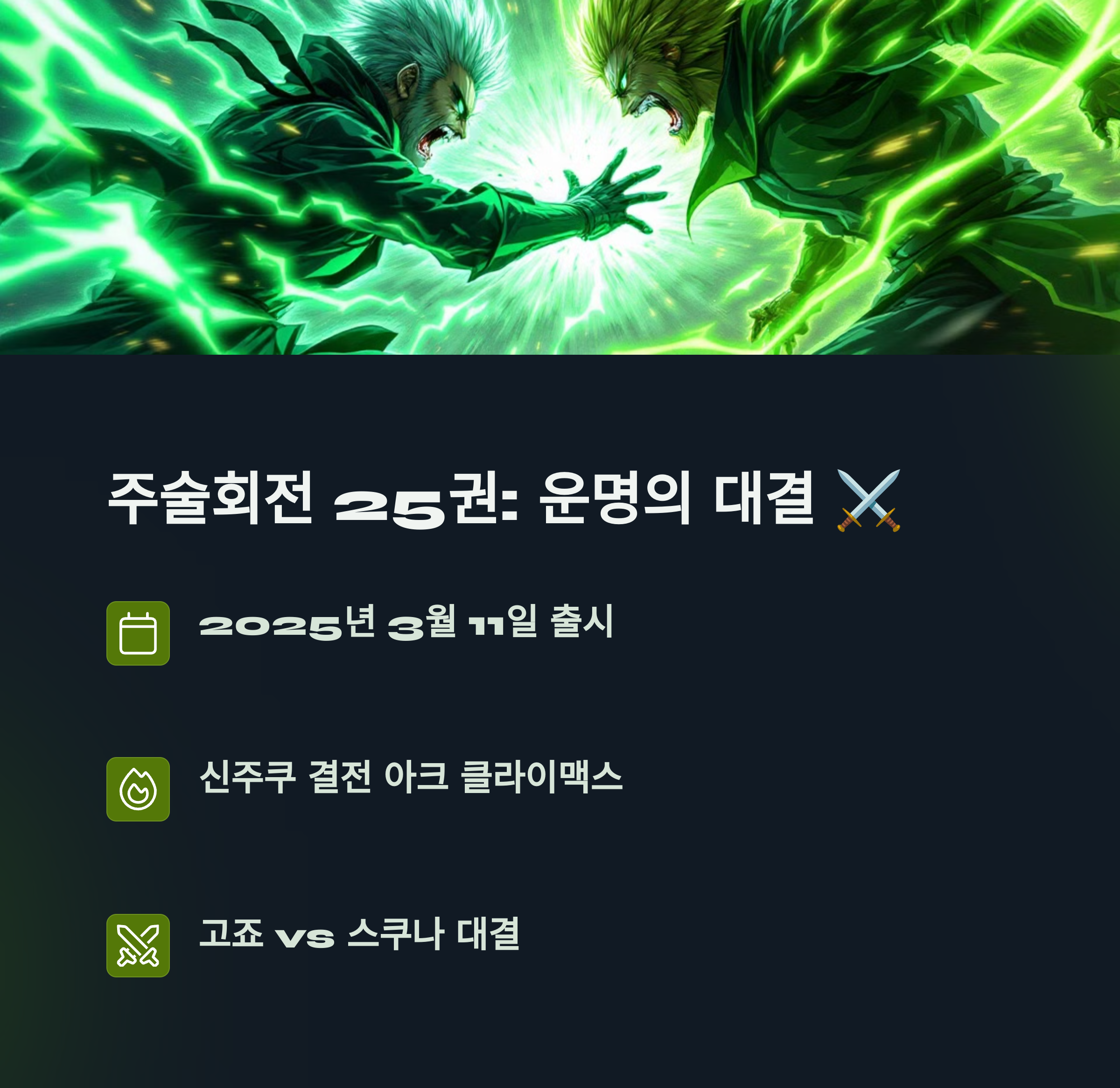 | Jujutsu Kaisen 25권 | 2025년 3월 11일 (영어판) | 신주쿠 결전 아크 진행, 고죠 vs 스쿠나 |