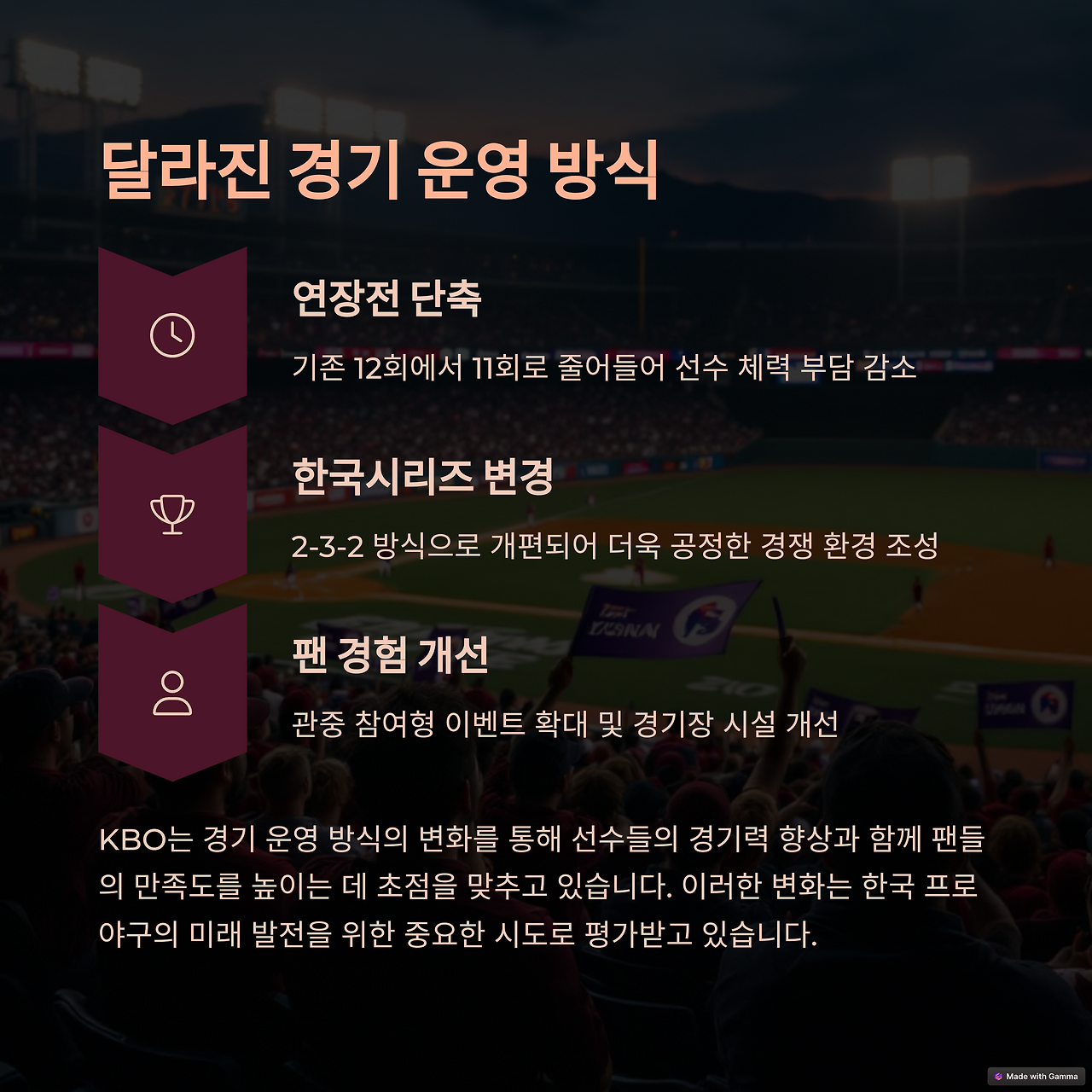 | 개막전 경기 | 피치클락 도입 | 한국시리즈 변경 |