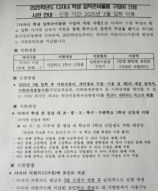 ✅ 지원 대상: 2025년 3월 기준, 경상남도 내 초/중/고등학교 및 특수학교에 입학하는 2자녀 이상 가정의 신입생 (작년과 동일)