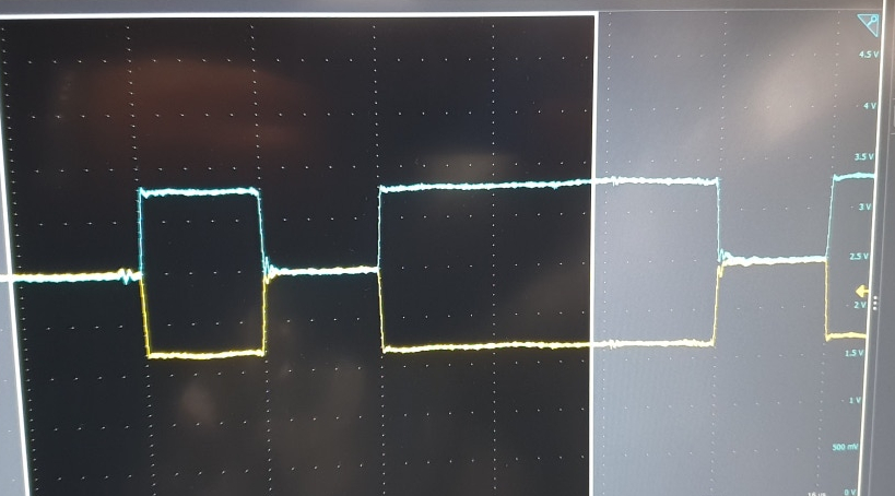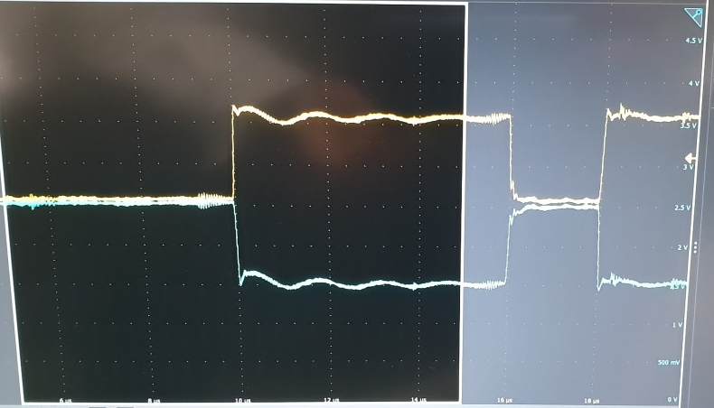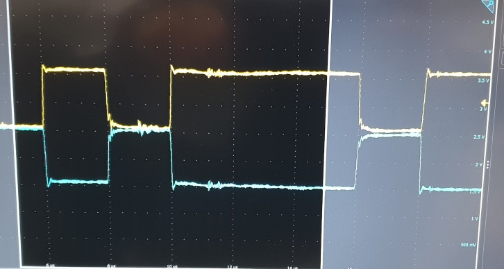 아래의 실제 오실로 스코프에서 측정한 파형으로서 통신이 시작되고 약간의 노이즈가 타는 모습을 보이는 형태입니다.