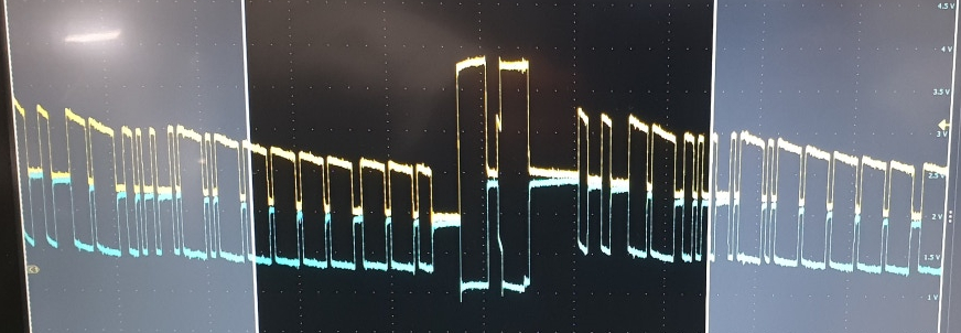 아래의 실제 오실로 스코프에서 측정한 파형으로서 통신이 시작되고 약간의 노이즈가 타는 모습을 보이는 형태입니다.