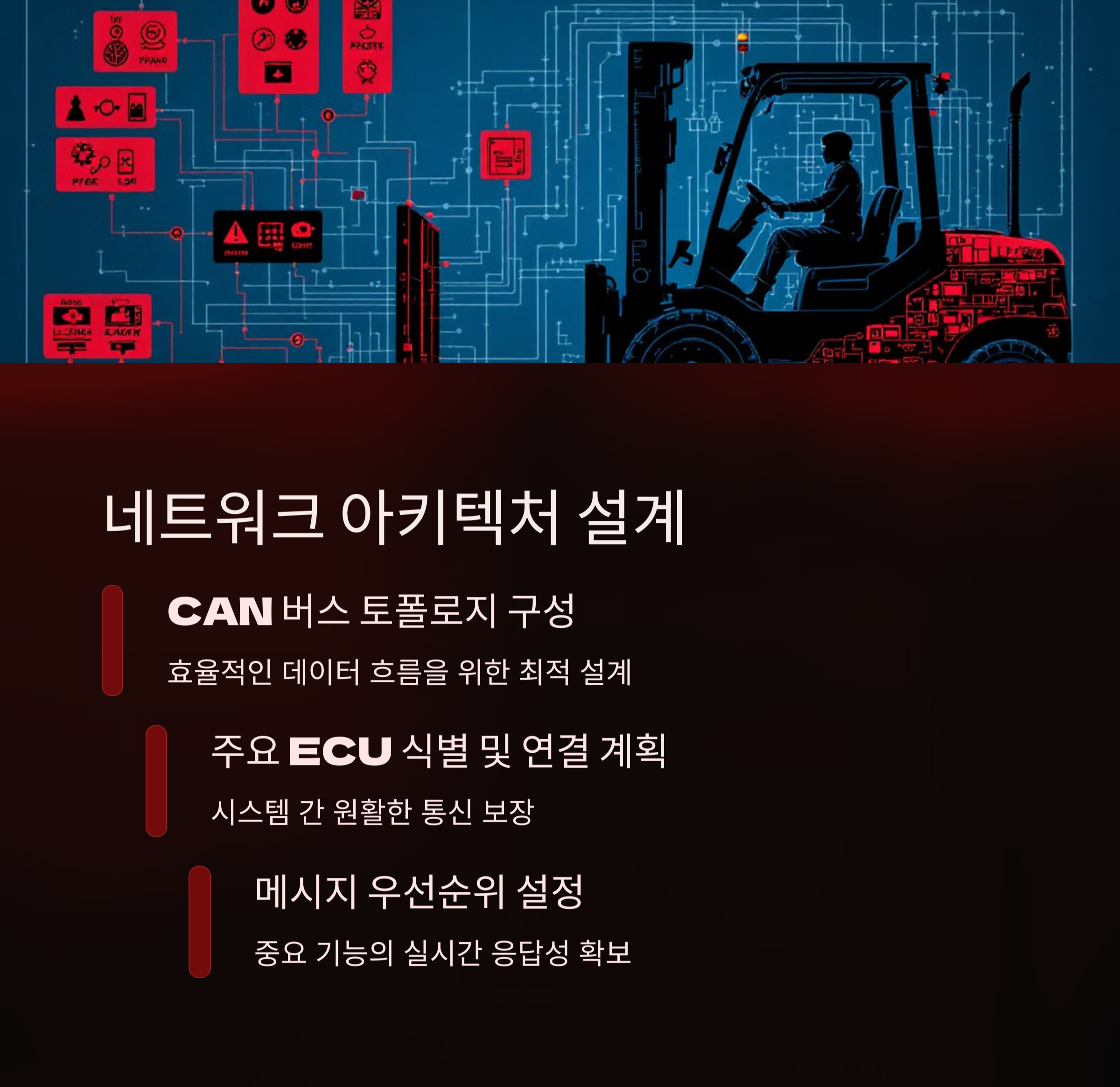 지게차 네트워크 아키텍처를 설계할 때, 단순히 모든 ECU를 하나의 버스에 연결하는 방식은 피했습니다. 대신, 기능적 중요도와 통신 요구사항에 따라 여러 개의 세그먼트로 나누는 접근 방식을 채택했습니다: