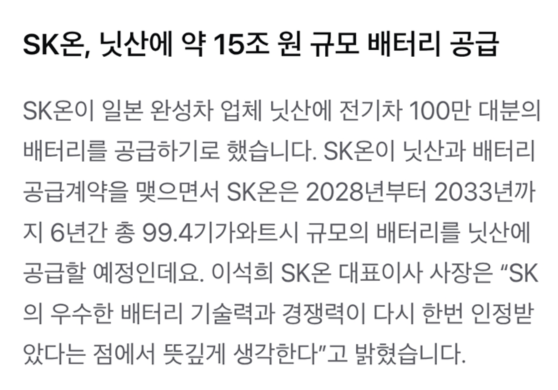 SK온이 일본 완성차 업체 닛산에 전기차 100만 대분의 배터리를 공급하기로 했습니다. 이번 계약에 따르면, SK온은 2028년부터 2033년까지 6년간 총 99.4기가와트시 규모의 배터리를 닛산에 공급할 예정입니다.